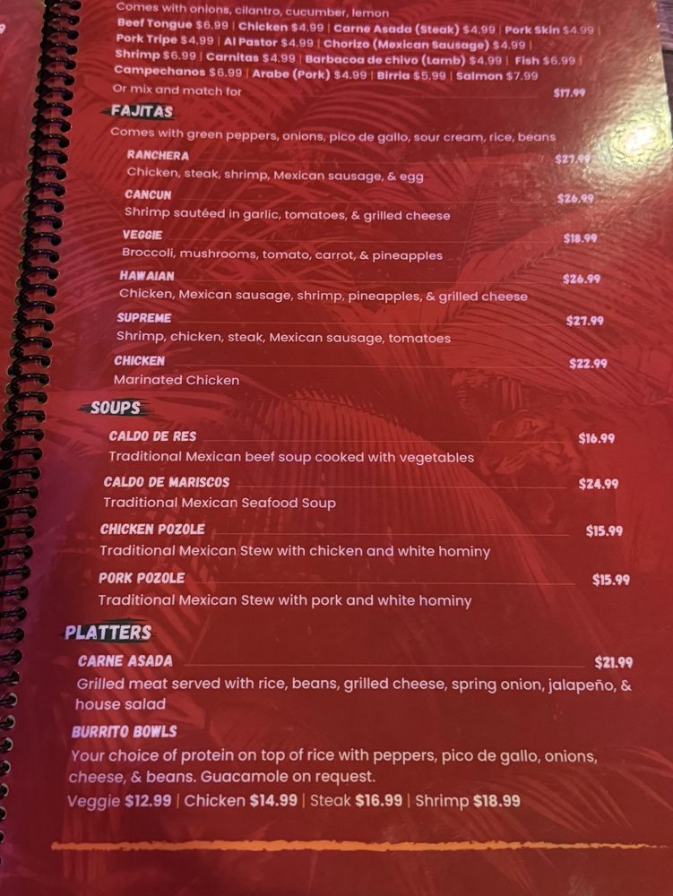 Chicken, Mexican sausage, steak, pork, cheese, roasted jalapenos, cactus, onions, house salsa, & avocados.